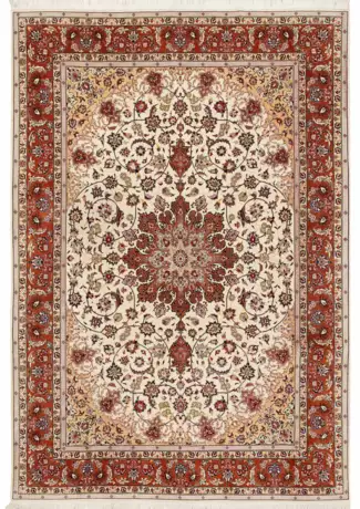 Persien. Korkwolle auf Baumwolle. Im elfenbeinfarbenen Innenfeld rotbraunes Zentralmedaillon mit Anhängern sowie cremefarbene Ecklösungen. Flächendeckende Musterung aus Palmettenranken. Umlaufend breite, korrespondierende Bordüre, begrenzt von schmalen Bändern. 353 cm x 251 cm.