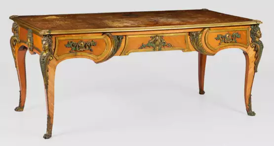 Nussbaum furniert sowie reiche Applikationen aus Bronze. Geschweifter Korpus, flankiert von plastisch gestalteten, weiblichen Genien, in stark geschwungene Beine übergehend. In der gegliederten Front breites Kniefach sowie drei Schubladen unterschiedlicher Größe. Rückseitig korrespondierende Blendschubladen. Allseitig profilgerahmte, gespielt angeordnete Furnierfelder sowie seitlich große Maskarons. Korrespondierende Deckplatte mit eingelegter Arbeitsfläche aus braunem, geprägten Leder. H. 78 cm. 182 cm x 92 cm.