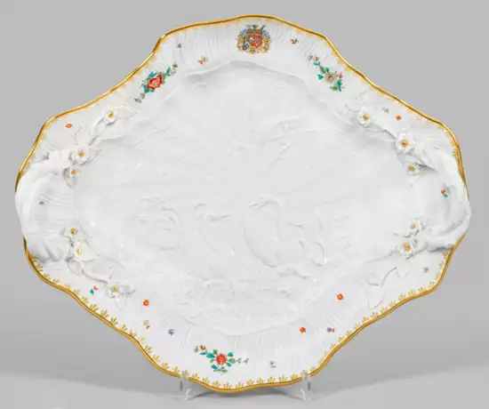 Ovale, vierpassig geschweifte, leicht vertiefte Form. Im Spiegel Reliefdekor aus zwei einander zugeneigten Schwänen, einem im Schilf stehenden und einem darüber fliegenden Fischreiher. Auf gerippter Fahne Indianische Blütenzweige und Streublumen sowie das Allianzwappen von Graf Heinrich von Brühl und seiner Gemahlin Franziska von Kolowrat-Krakowsky. Seitlich gewundene Asthenkel in reliefplastische Blüten und Blätter übergehend. Polychrome Malerei mit gekämmter Goldkante und Goldrand. Entw. wohl Johann Friedrich Eberlein. Modell-Nr. 5298. Aus der Jubiläumskollektion. Limitierung 20/50. Zertifikat. Schwertermarke mit Goldsignet. 50 cm x 42 cm.