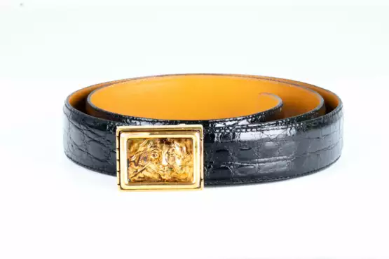 Belt buckle by A. Testoni, gold-plated, centre piece by Octave Landuyt, probably 750 yellow gold, leather strap by A. Testoni made of crocodile leather, length 110 cm, weight of buckle approx. 48.1 g Custom-made for a collector of the artist's work, signs of wear in the form of small scratches and abrasions