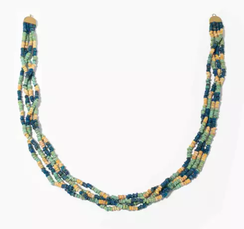 Ägypten, wohl Spätzeit (664–332 v. Chr.) Lapislazuli sowie Fayence-Perlen in Türkis und Beige. Modern aufgezogen als viersträngiges Collier. L 56 cm.