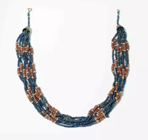Ägypten, wohl Spätzeit (664–332 v. Chr.). Fayence in Blau-, Türkis- sowie Brauntönen. Modern als achtsträngiges Collier aufgezogen. L 51 cm.