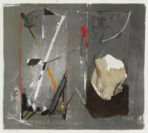 Container. Farblithographie, überarbeitet und Collage. 90/100. Unten rechts in Bleistift signiert. Lichtmass 38x42,5 cm. Gerahmt.