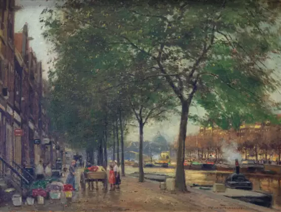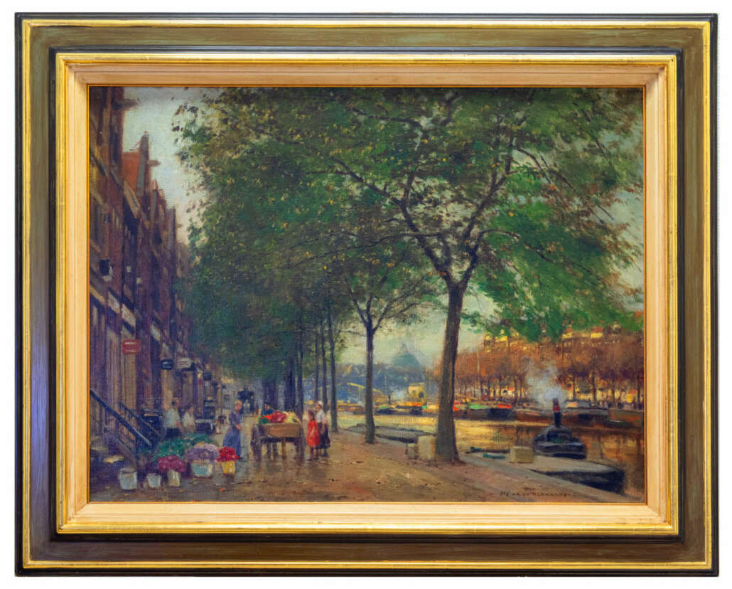 Flower market in a Dutch town with canals, oil on canvas, 61 x 80 cm canvas dimensions, signed, in need of cleaning