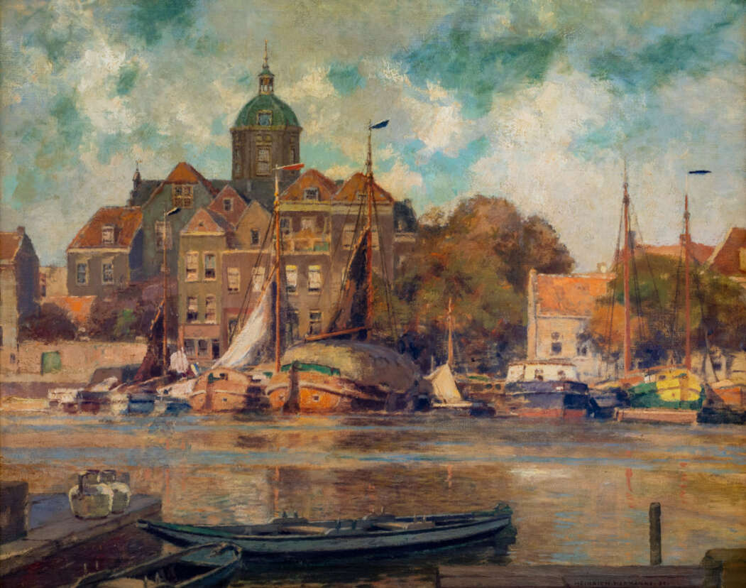Dutch Harbour scene, oil on canvas, 78 x 96 cm canvas size, signed, dated 1934, in need of cleaning