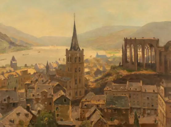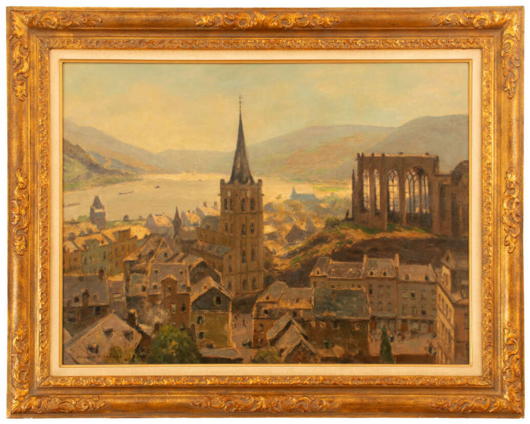 Spring Morning in Bacherach, on the Rhine, oil on canvas, 60 x 80 cm canvas dimensions, signed, dated 1937, titled, in need of cleaning, partially minimally retouched