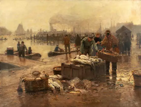 Fish Market, oil on canvas, 96 x 125 cm canvas dimensions, signed, craquelure, partially