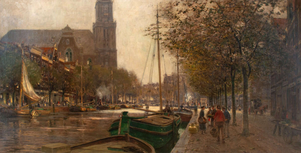 City view with canal, oil on canvas, 86 x 164 cm canvas dimensions, rubbed, in need of cleaning, partially minimally retouched