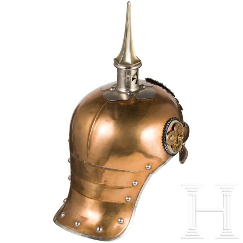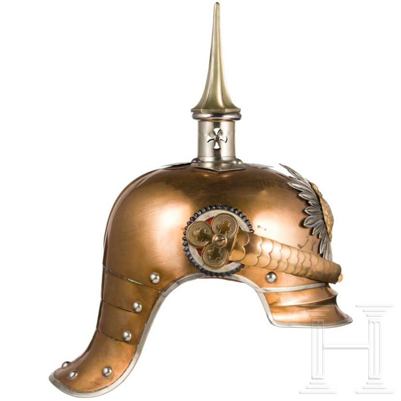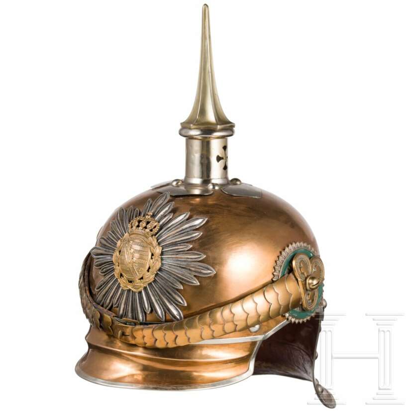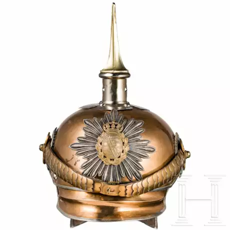 Zusammengestellt. Die Tombakglocke (kleine Dellen) mit vernieteten Schirmen, wohl ein mitbefördertes Mannschaftsmodell mit Doppellöchern, die Schirme mit braunem Leder unterfüttert, braunes Lederlaschenfutter. Silberne Einfassungen, Ziernieten und Sternemblem mit goldenem Landeswappen. Schlanke, sechsfach gekehlte Spitze (starr, nicht drehbar) auf Kreuzblatt mit drei Rundkopfschrauben und einem Rundkopfsplint. Gewölbte lederunterlegte Schuppenketten, an Kleeblättern verschraubt, Offizierskokarden. Partiell leicht beschädigt, Altersspuren.