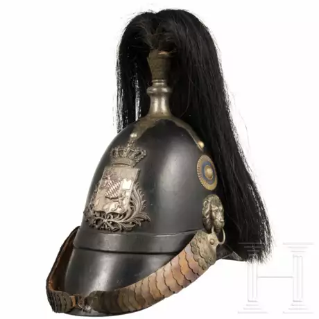 Derbe Lederglocke (partiell berieben), versilberte Beschläge (gedunkelt). Stirnseitig aufgelegtes, geprägtes Emblem. Oben ein Kreuzblatt mit schwarzem Rosshaarbusch an Zwiebel aus Stoffgespinst (Fehlstelle), flache, lederunterfütterte Schuppenketten (Riemchen unvollständig) an Löwenköpfen, Metallkokarde. Schön erhaltenes rotes Lederlaschenfutter. Leicht beschädigt, Altersspuren.