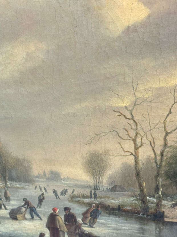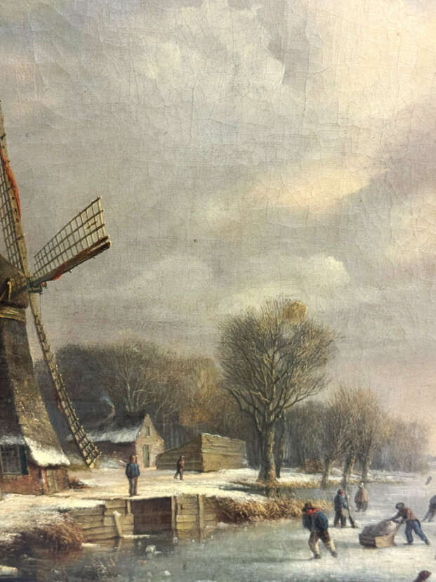 Winter Landscape with Ice Skaters and Windmills, oil on canvas, 52 x 62 cm, signed, craquelure, paint abrasion in the frame area, partially retouched, slightly yellowed