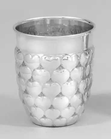 Silber Gering konisch mit profiliertem Lippenrand. Wandung sechsreihig versetzt umzogen von reliefplastischen Herzen. Unterseite mit Inschrift "W.B. 29.5.1983". Innen vergoldet. Gest. 800, Beschau- und undeutliches Herstellerzeichen. Gew. ca. 150 g. H. 10 cm.