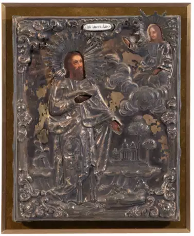 Russisch, 19.Jh. (1) Ikone. Tempera über Kreidgrund auf Holz. Ganzfigur des Apostels Jakobus mit Evangelium, mit der einen Hand auf eine Klosterarchitektur zeigend. In der rechten oberen Ecke Christus über Wolkenband. (2) Oklad. Silber, vergoldet. Stadtmarke von Moskau. Marke des Beschaumeisters "AS 1833" (kyrill.) nicht identifizierbar. Marke des Meisters "MZ" (kyrill.) nicht identifizierbar. Reicher floraler Reliefdekor. 24,5x20 cm. Auf mit grünem Samt bezogene Unterlage mit Metallrahmen montiert. 28x23 cm.