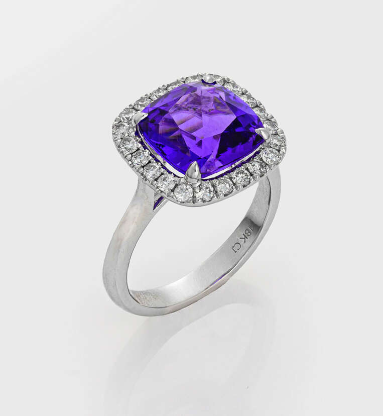 Weißgold, gest. 750. Zentral besetzt mit einem blau-violettem Tansanit von ca. 5,64 ct. im Cushion Square Cut, entouriert von Brillanten von zus. ca. 0,53 ct. (H/vsi). Gew. ca. 6,72 g.