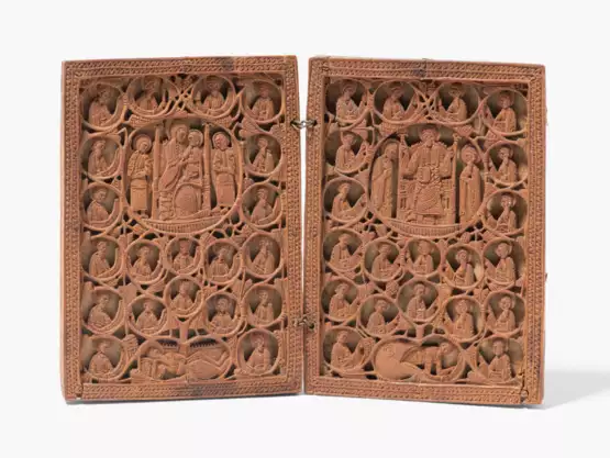 Russisch, 19.Jh. Hartholz geschnitzt. Linker Flügel: Wurzel Jesse. Im zentralen Medaillon Gottesmutter mit Kind, flankiert von 2 Engeln. Rechter Flügel: Deesis im zentralen Medaillon, umgeben von Heiligen, u.a. Prophet Jona, der von einem Walfisch ausgespien wird. Je 7,5x5 cm.