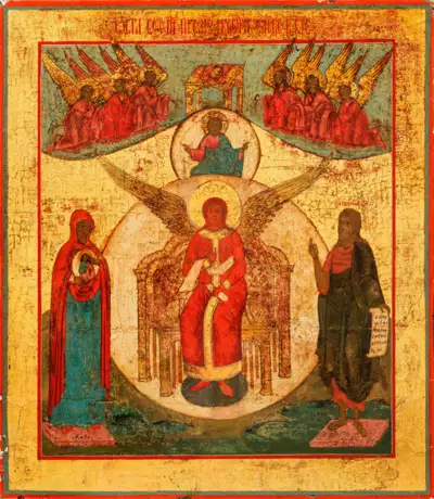 Tempera und Gold auf Holz. Im Zentrum thront Sophia in Engelsgestalt umgeben von einer prächtigen Aureole, zu ihrer Rechten die Gottesmutter, zu ihrer Linken Johannes der Vorläufer. Darüber schwebender Jesus Christus mit segnendem Gestus. Bekrönt wird die Szene durch den von sechs Engeln begleiteten, goldenen Thron, der als Symbol für den Gottvater angesehen wird. Kirchenslawisch bez.; 36 cm x 31 cm x 4,5 cm.