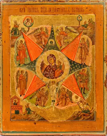 Tempera und Gold auf Holz. 2 rücks. Sponki. Die alttestamentliche Erzählung des unverbrennbaren Dornbusches, den Moses sah und aus dem der Engel des Herrn zu ihm sprach, gilt als Prophezeiung der Jungfräulichkeit Mariens. Im 16. Jh. entwickelte die russische Ikonenmalerei hierzu ein komplexes Motiv: Die Gottesmutter mit dem Kind im Zentrum eines aus zwei konkaven Vierecken gebildeten Sterns, der von einer achtpassigen Rosette eingefasst wird. In den einzelnen Bildfeldern sind Evangelisten und Engel wiedergegeben und die Ecken bilden vier alttestamentliche Erzählungen ab, die als biblische Weissagungen der Jungfräulichkeit Mariens verstanden werden. Kirchenslawisch bez.; 34,5 cm x 26 cm x 3 cm.