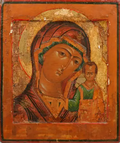 Tempera und Gold auf Holz, ein Rückseiten-Sponki fehlend. Im vertieften Mittelfeld Darstellung der Gottesmutter mit segnendem Christuskind im Typus der Kasanskaja. Besch., rest.; 27,5 cm x 23 cm.