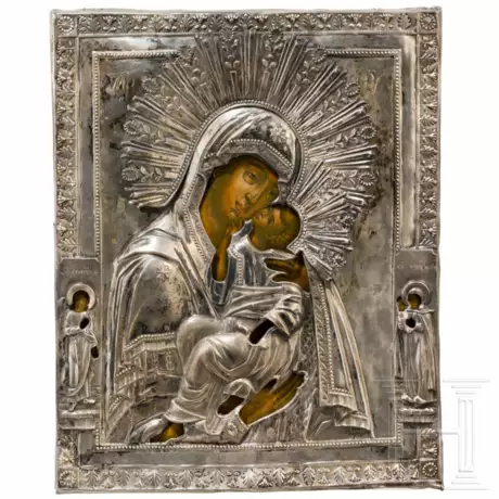 Lot 534 | Ikone mit der Gottesmutter (vermutlich von Jaroslawl) mit Silberoklad, Russland, Moskau, 19. Jhdt.