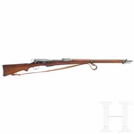 Cal. 7,5x55, SN. 319610, nummerngleich inkl. Magazin, ausgen. Visier. Blanker Lauf. Sechsschüssig. Auf der Hülse "BP",links "P" für privatisiert. Dt. Beschuss 1972. Originale Brünierung, gering fleckig an den Bändern und an der Hülse. Nussholzschaft mit angesetztem Pistolengriff und Tragespuren. Komplett mit Repro-Beriemung. Länge 130 cm.