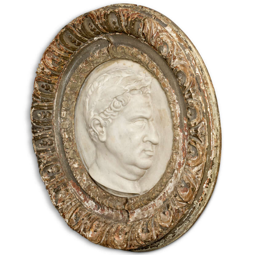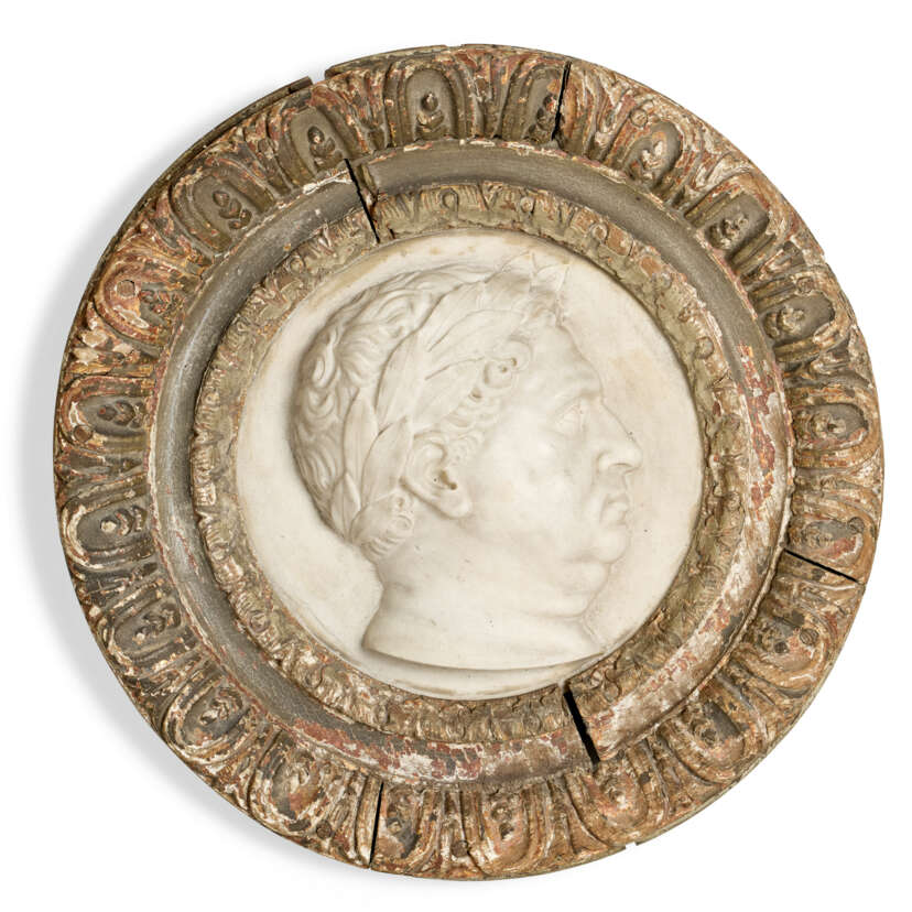 marbre, médaillon en relief, dans un cadre du XVIIIe siècle en bois sculpté et doré ; accidents au cadre