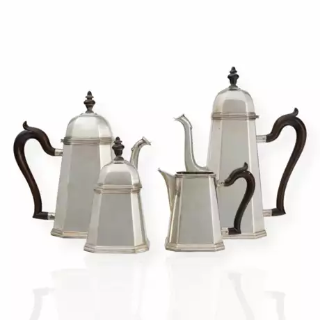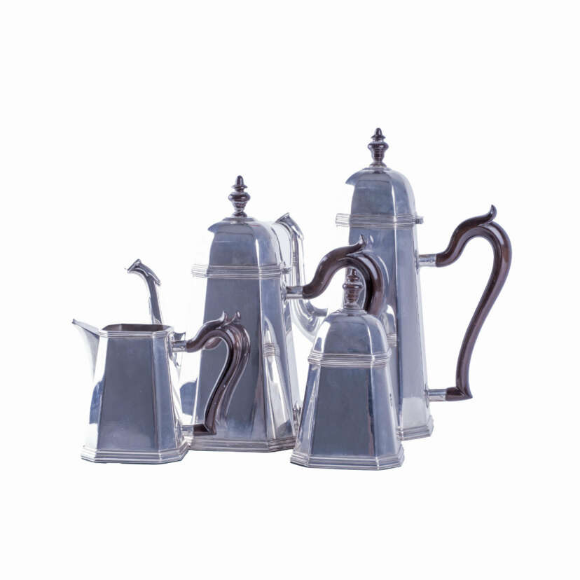 4 pieces, Italy, city mark Milan, after 1968, fineness 800, hallmarked, marked 'mano Lavorazione' (handcrafted), coffee and tea pot with octagonal, conical body, handle and lid knob made of brown lacquered wood, hinged lid, height 27/23 cm, milk jug height 11.5 cm, sugar bowl height 16 cm, total weight approx. 2096 g, with signs of polishing and use