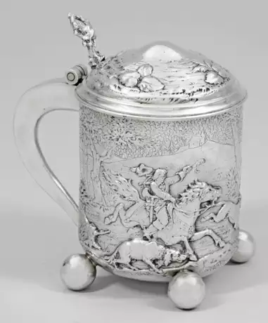 Silber, teilw. vergoldet. Zylindrische Wandung mit reliefplastischer Darstellung eines berittenen Jägers mit Jagdhunden bei der Hirschhatz in waldiger Landschaft. Auf dem Deckel Blattwerk. Innen vergoldet. Gest. 800, Beschauzeichen. Gew. ca. 705 g. H. 19,5 cm.