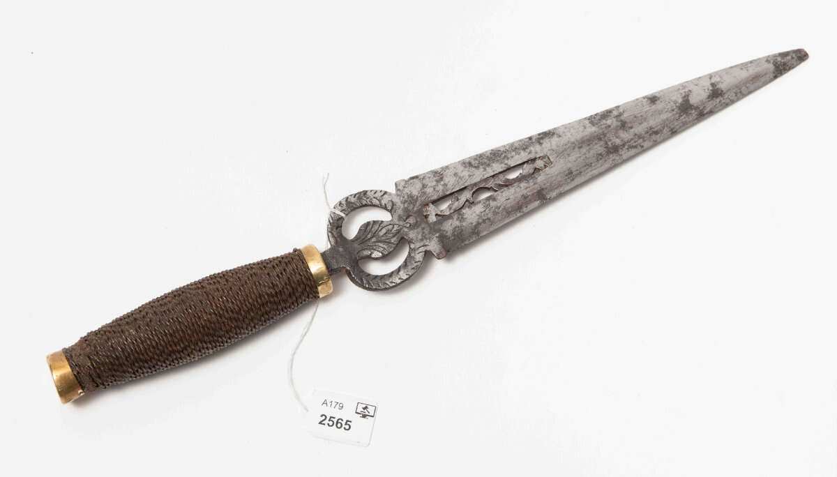 Italien, um 1800. Griffstück aus der bauchigen Hilze eines militärischen Degens, mit Knaufkappe und Griffzwinge aus Messing. Zweischneidige Klinge (L 21,5 cm) mit ringförmig durchbrochen gestalteter Fehlschärfe. Das Klingenblatt am Ansatz mit einer in Durchbruchsarbeit gestalteten Blattranke verziert. Von der eigentlichen Spitze ca. 3 mm abgebrochen. L 32,5 cm.