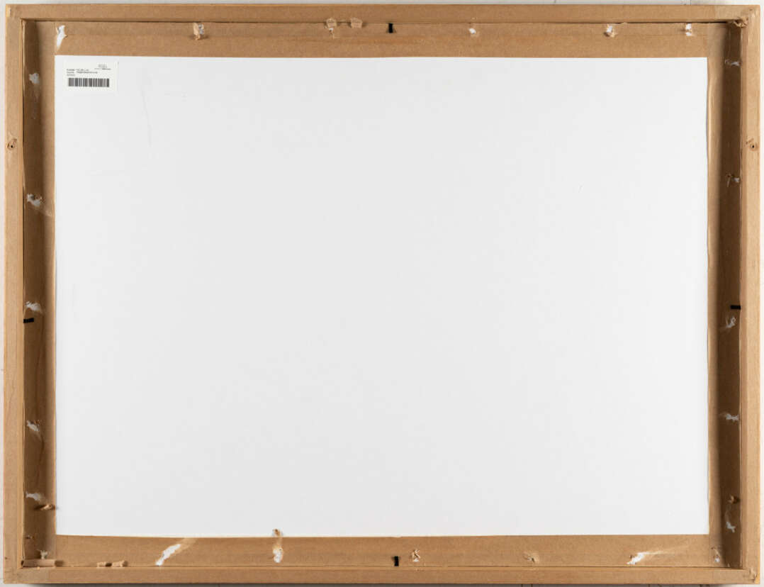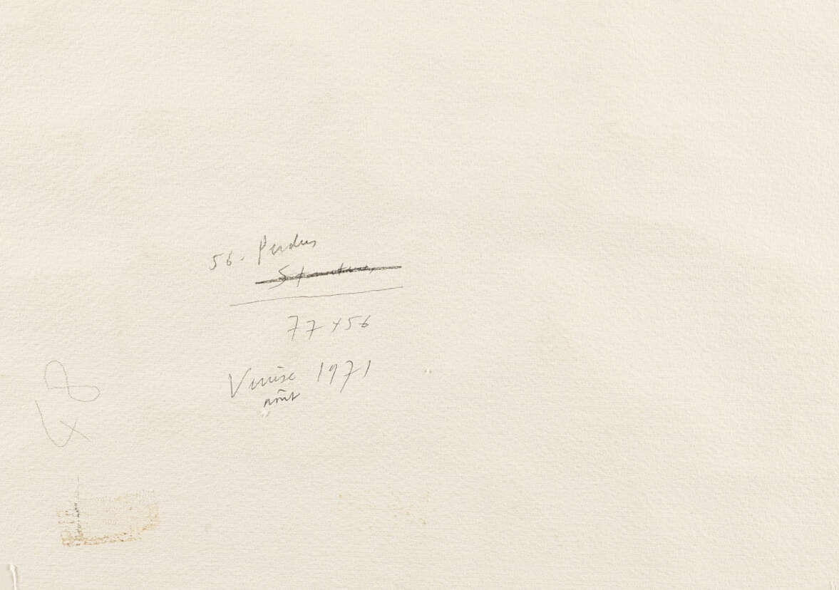 Recto am oberen Rand ins Passepartout fixiert, teils losgelöst. Unregelmäßige Farb- bzw. Feuchtigkeitsspuren an den Rändern außerhalb der Darstellung, vor allem am rechten Rand (wohl Atelier). Ansonsten in sehr gutem Zustand.