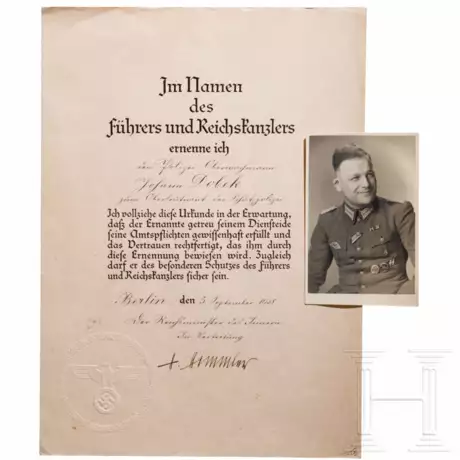 Lot 4333 | Johann Dobek - Beförderungsurkunde, signiert von Heinrich Himmler, mit Portraitfoto, Träger des Blutordens