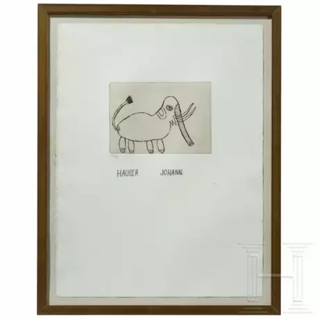 Radierung. Unkonventionelle Darstellung eines Elefanten im Profil. Signiert "Hauser Johann.", mit Nummer 68/100. Leicht fleckig. Im schlichten Leistenrahmen, hinter Glas. Maße der Radierung ca. 10,5 x 15 cm, Gesamtmaße ca. 45,5 x 36 cm.