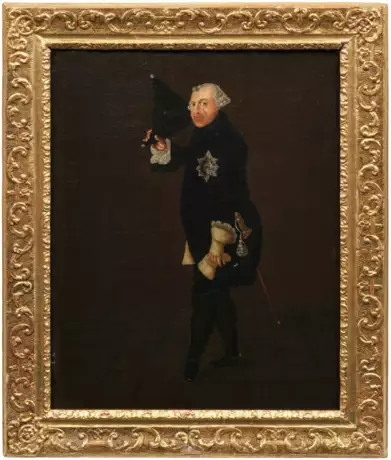 Ganzfiguriges, repräsentatives Bildnis König Friedrich II. von Preußen im Dreiviertelprofil, im schwarzen Uniformrock mit dem Stern des schwarzen Adlerordens, den Dreispitz zum Gruß ziehend. Die Darstellung geht auf ein berühmtes, einflussreiches, 1763/64 im Auftrag des Königs von Johann Heinrich Christian Franke geschaffenes Gemälde zurück, das sich heute im Besitz der Stiftung Preußische Schlösser und Gärten befindet. Das Bildnis fand durch Wiederholungen durch Franke selbst und aus seiner Werkstatt sowie in zahlreichen Repliken und Kopien bis um 1780 weite Verbreitung. Öl/Lwd., doubl.; 60,5 cm x 47,5 cm. Rahmen.
