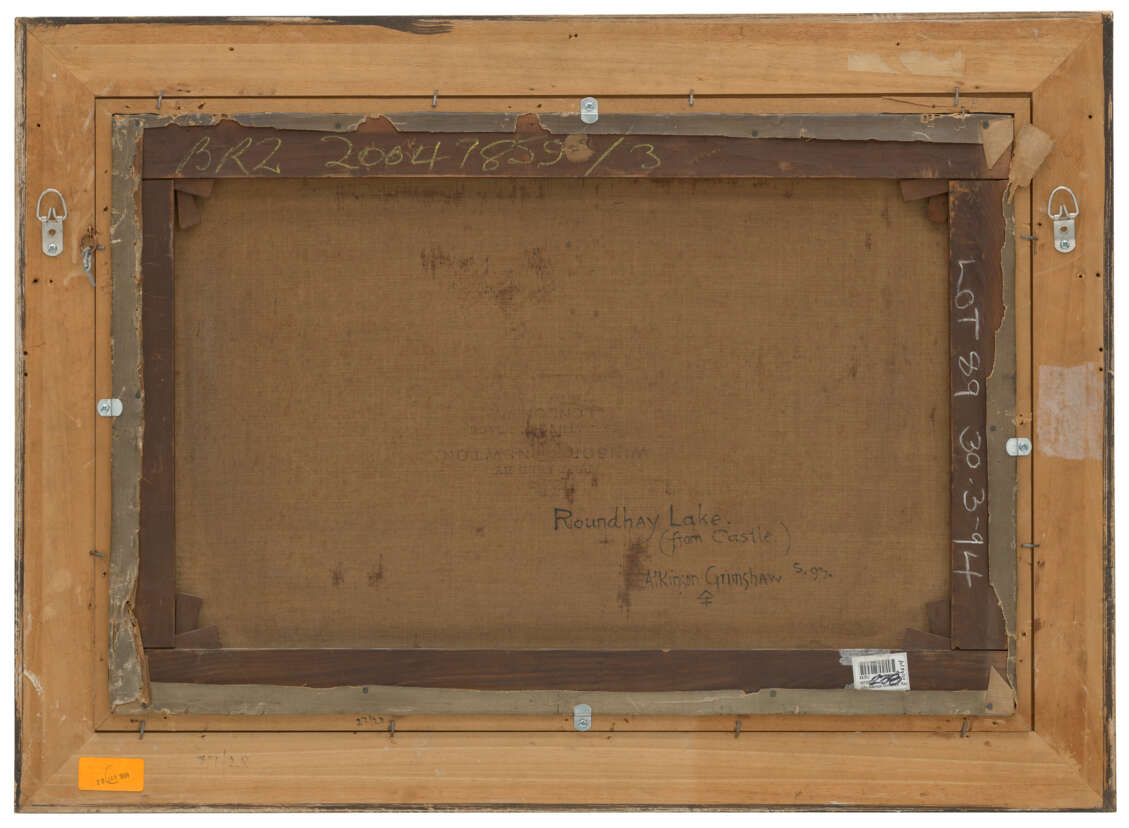 signed 'Atkinson Grimshaw' (lower right); signed, dated and inscribed 'Roundhay Lake/(from Castle)/Atkinson Grimshaw 5.93'. and with artist's device (on the reverse)
