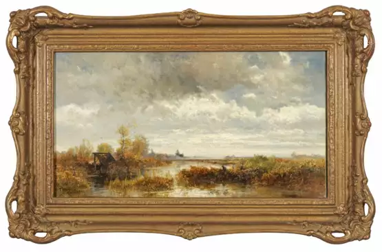 Detailreich geschilderte Sumpflandschaft mit Schilf und vereinzelten Birken und Weiden. Charakteristische Stimmungslandschaft Wengleins, der an der Münchner Akademie bei Johann Gottfried Steffen und Adolf Lier studierte. Er gehörte neben Ludwig Willroider zu den letzten Hauptvertretern der Münchener Landschaftsschule des 19. Jhs.; Besonders seine Werke aus der Tölzer Zeit spiegeln seine präzise Naturbeobachtung. Öl/Lwd. doubl.; R. u. sign. 50,5 cm x 76 cm. Rahmen.