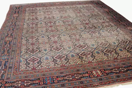 Z-Persien, um 1900. Elegante und dekorative Joshaghan-Musterung. Das gesamte, in einem schönen Beige gehaltene Innenfeld ist durchgehend mit Kartuschenfeldern in verschiedensten Variationen überzogen, die im Inneren mit Blütenpalmetten, Floralmotiven und geometrisch gezeichneten Zweigen in unendlichem Rapport geschmückt sind. Hellblau-rote Blüten-Nebenbordüren umfassen die elegante nachtblaue Hauptbordüre, die ebenfalls mit einer charakteristischen Joshaghan-Musterung belegt ist. Mottenschaden, fleckig, starke Gebrauchsspuren. 317x417 cm (ft. 10.5x13.8).