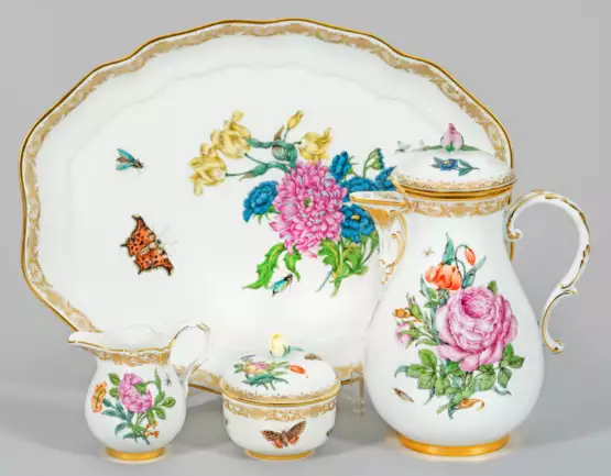 4-tlg.; Kaffeekanne, Sahnegießer, Zuckerdose und Tablett. Form "Neuer Ausschnitt". Rocailleförmige Asthenkel. Deckel mit reliefplastischer Bekrönung einer Rosenblüte. Schauseitig der Wandung und im Spiegel Blumengebinde in sog. "FF-Bukett-Malerei" nach Kupferstichvorlagen ohne Schatten. Rücks. der Kanne ein kleineres Blumenarrangement. Fliegende Insekten und Schmetterlinge. Feine polychrome Malerei mit Goldspitzenbordüre und Goldstaffage. Schwertermarke. Kanne-H. 25 cm. Tablett 37,5 cm x 29 cm.