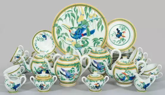 33-tlg.; 2 große und 2 kleine Kaffeekannen, 2 Sahnegießer, 2 Zuckerdosen, 12 Kaffeetassen mit Untertassen, 12 Kuchenteller, Tortenplatte. Farbenprächtiger Dekor mit Tukanen. Bez. "HERMÈS". Teilw. minim. Gebrauchsspuren. Firmen- und Manufakturmarke. Kannen-H. 14 cm - 17 cm. Platten-D. 31,5 cm.