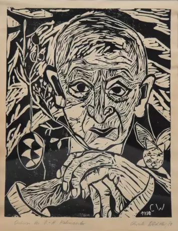 Lot 282 | Kahnweiler-Holzschnitt "Porträt-Christa Wächtler-1937 Rostock", betitelt "Ostern bei Kahnweiler", handsign., bez. und dat. 1970, Blatt gebräunt und wellig, 43,5x32,5 cm, im Passepartout (stockfleckig)…