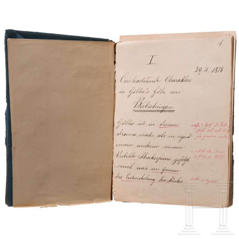 Gebundenes Schulheft mit Umschlagdeckeln aus gewachster Pappe, in blaues Papier eingeschlagen, vorderseitig betitelt "I b - Deutsche Aufsätze - Wilhelm v. Preussen" (ca. 19,7 x 16,5 cm, leicht beschädigt, eingerissen). 91 von Wilhelm eigenhändig nummerierte und beschriebene Seiten, Korrekturränder mit vielen in roter Tinte angebrachten Verbesserungen, Anmerkungen und Schlusskommentaren seines Deutschlehrers Dr. Heußner. Insgesamt sechs Aufsätze in schwarzer Tinte, der erste vom 29.4.1875 mit dem Titel "I. Contrastirende Charaktere in Göthe's Götz von Berlichingen", "II. Brutus nach Shakespeare's Julius Caesar" oder "IV. Lichtseiten der Helden des Nibelungenliedes". Einige Seiten lose, ansonsten in gutem und farbfrischem Zustand, insbesondere die gestochen feine Schrift des damals 16-jährigen Prinzen sehr schön zu lesen.