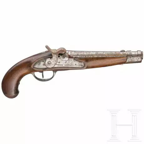 Steinschloss auf Perkussion aptiert. Rauer Lauf im Kal. 18 mm. Lauflänge 22 cm. Schlossplatte gemarkt in "kyrillischer Schrift / 1806" (Fälschung? - interessante Version). Nussholzschaft mit Schaftsprung im Schlossbereich. Alle Eisenteile flugrostig. Durch behutsame Reinigung deutlich zu verbessern.
