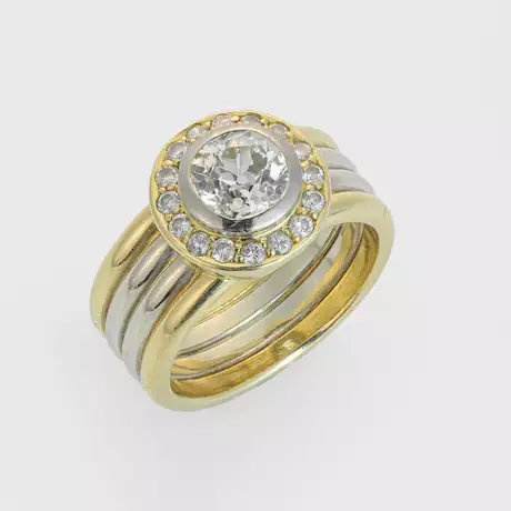 Gelb- und Weißgold, 18 k. Zentralbesetzt mit einem Altschliffdiamanten von ca. 1,00 ct. entouriert von Brillianten von ca. 0,30 ct. Gew. ca. 12,1 g.