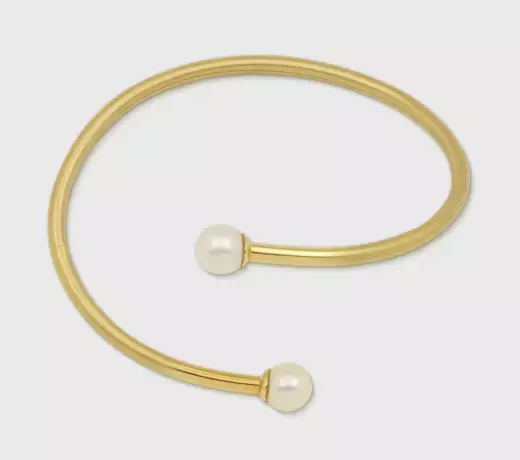 Gelbgold, 18 k. Mattierter, diagonal verlaufender Armreif, endend mit 2 cremefarbenen Perlen von ca. 8 mm. D. 7 cm. Gew. ca. 18,27 g.