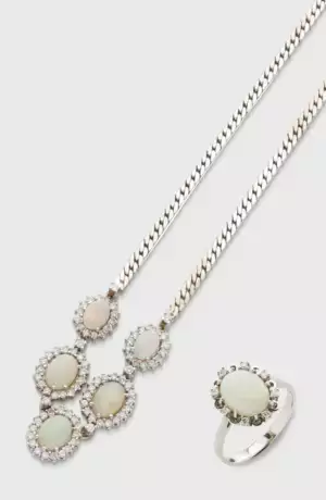 Necklace and ring set with opal and diamonds approx. 1,90 ct., in 14 k white gold.