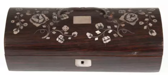 Lot 604 | Kleine Schmuck-Schatulle mit floralen Perlmuttintarsien, um 1900, gewölbter Deckel mit Klapphenkel, 4,5x14,5x6 cm