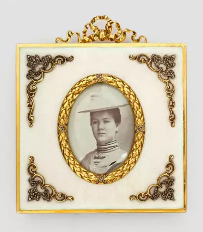 im Stil von Karl Fabergé. Silber, vergoldet und teilw. emailliert. Quadratische Form, bekrönt von freiplastischem Schleifenornament. Guillochierter und weiß emaillierter Grund. Ovaler, mit Lorbeerkranz und Kreuzbanddekor versehener Bildausschnitt. Die Ecken verziert mit applizierten Ornamenten, besetzt mit kleinen Diamantrosen. Rückseitig aufstellbar. Minim. ber.; Gest. 88. 9,5 cm x 8 cm. Bildausschnitt: 4,3 cm x 3,3 cm.