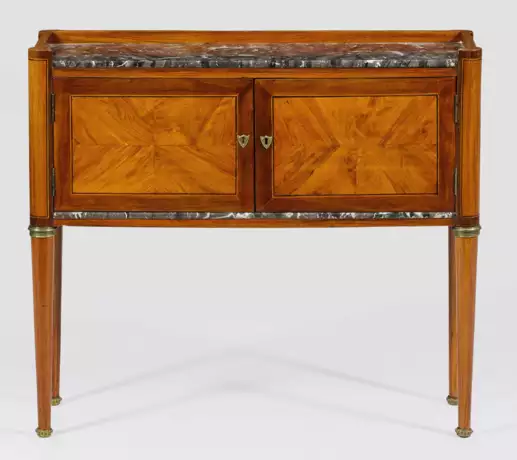 Rosenholz und Mahagoni, furniert. Gerader, querrechteckig angelegter Korpus, flankiert von gerundeten Ecken auf konischen Rundbeinen. In der gegliederten Front zwei Türen. Galeriegerahmte Deckplatte aus grau-weiß gemasertem Marmor sowie innen korrespondierender Boden. Allseitig breit gerahmte, teilw. gespiegelt angeordnete Furnierfelder. Unterhalb Brandstempel BV mit Bügelkrone. H. 71 cm. 80 cm x 28 cm.