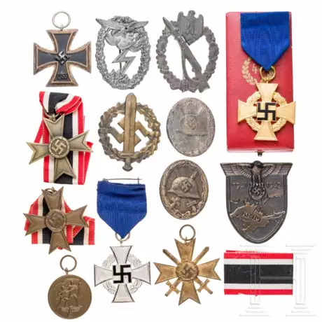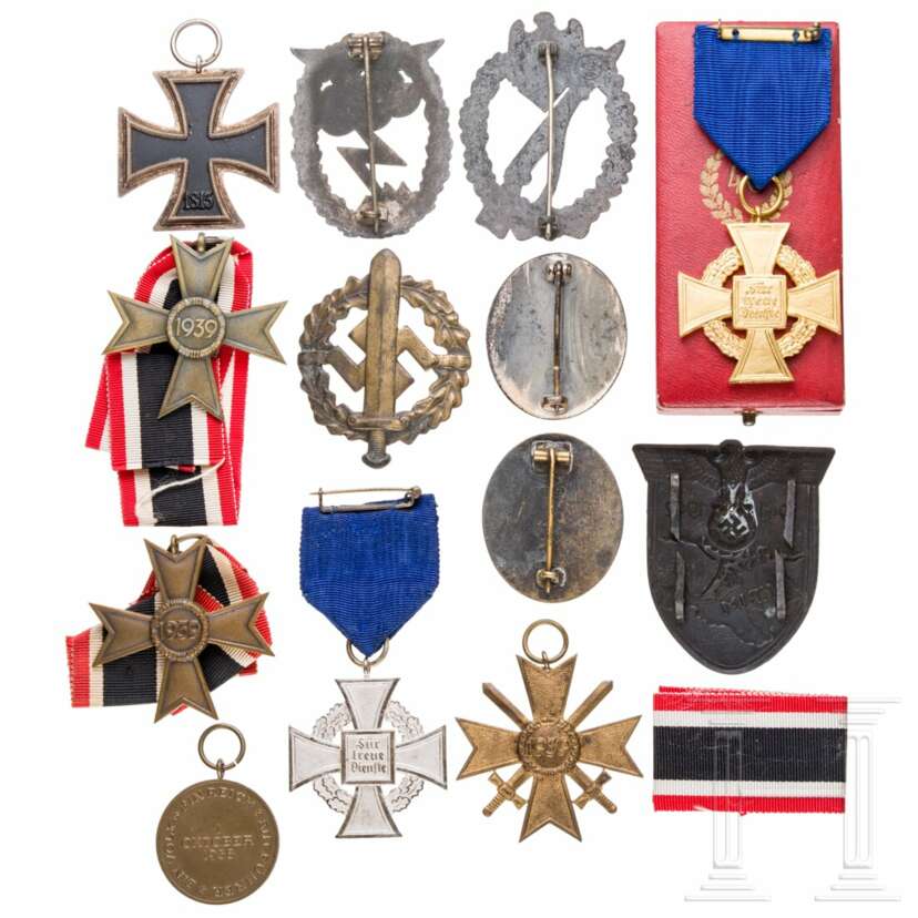 EK 2 (im Ring undeutlich punziert "125"?), Krimschild (ohne Stoff und Gegenplatte), VWA in Silber und Gold (jeweils migriert), ISA in Silber, SA-Sportabzeichen in Bronze, Treuedienst-Ehrenzeichen für 25 und für 40 Jahre, Erdkampfabzeichen (Hakenkreuz entfernt - swastika removed) und vier weitere Abzeichen. Teils beschädigt, ohne Band.