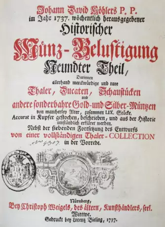Kirchner 949. Lipsius 213. - Vollständige Reihe der wöchentlich herausgegebenen Stücke. "Seine 'Historischen Münzbelustigungen'... ist ein grundlegendes Werk und wird das Gedächtnis seines Namens auf lange hinaus vor Vergessenheit schützen" (ADB XVI, 443). - In den wöchentlich herausgegebenen Stücken beschreibt Köhler jeweils eine Münze bzw. Medaille mit historischen Kommentaren. - Stellenweise etw. gebräunt u. fleckig.