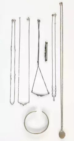 Silberschmuck. Silber 925. Bestehend aus fünf Ketten, einer Brosche und einem Armreif. 32,4 gr. (S43).