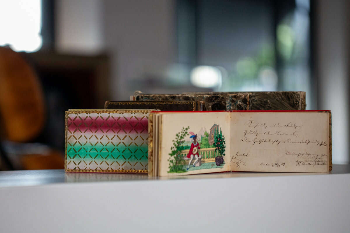 With dedications from friends, numerous watercolours, glued-in coloured prints, embroidered and embossed pictures, contributions from approx. 1815-1850, height 9.5-12 cm, width 15-19.5 cm, pages loose in 2 copies, frequently rubbed, bindings loosened, partially crushed, edge wear